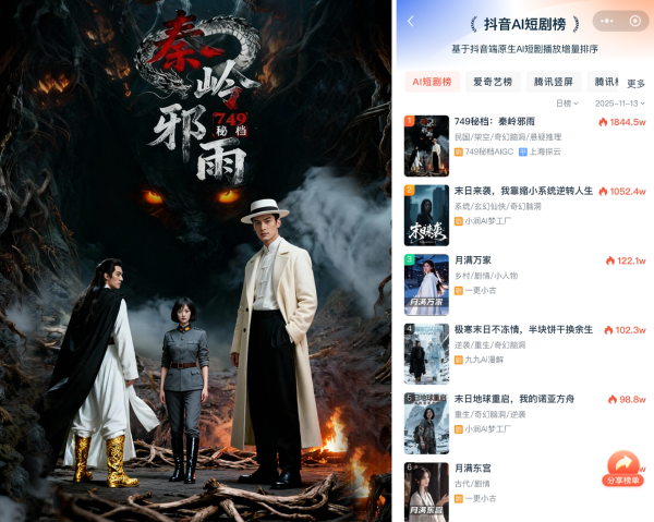 近日,由探云AI团队推出的魔幻悬疑类AI短剧《749秘档:秦岭邪雨》在抖音平台热播。该剧自2025年11月12日上线后,仅19小时即松弛千万播放量,当今该剧单抖音平台的播放量已松弛2000万,并攀升至抖音AI短剧榜TOP 1。这一数据推崇不仅体现出 AIGC 技艺在影视创作范围备受市集关心,也考据了探云AI团队通过技艺初始实质坐褥的贸易形状已具备范围化讹诈的后劲。